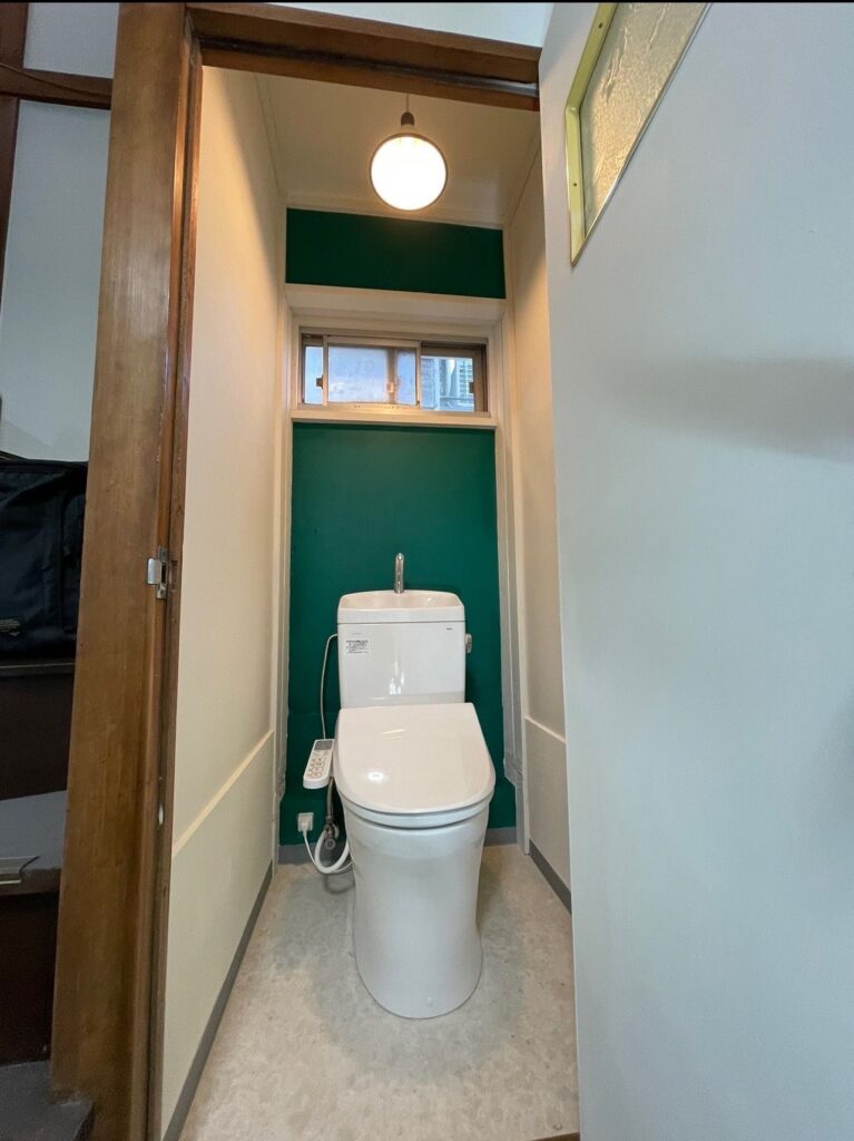 今回は壁紙ではなく、モルタル壁と木部を塗装、オーナーさまからのご提案で、トイレ一面をグリーンに、その他をホワイトに塗り替え😄